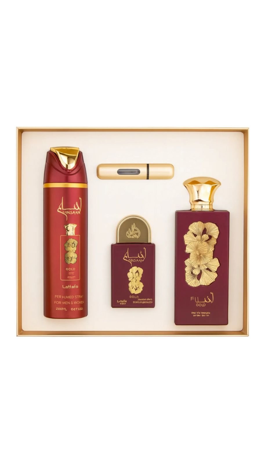O conjunto inclui um frasco de 100 ml, um de 20 ml e um spray perfumado de 200 ml, proporcionando versatilidade para diferentes ocasiões. Originário dos Emirados Árabes Unidos, Ansaam Gold é livre de crueldade, refletindo um compromisso com a ética e a responsabilidade.